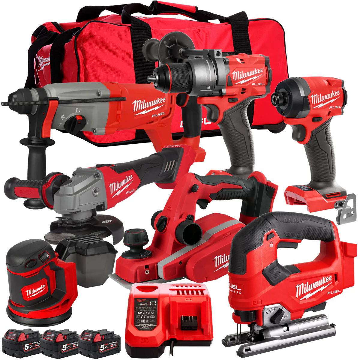 Milwaukee 18V Cordless 7 Piece Tool Kit with 3 x 5.0Ah Batteries & Charger in Bag T4TM-19