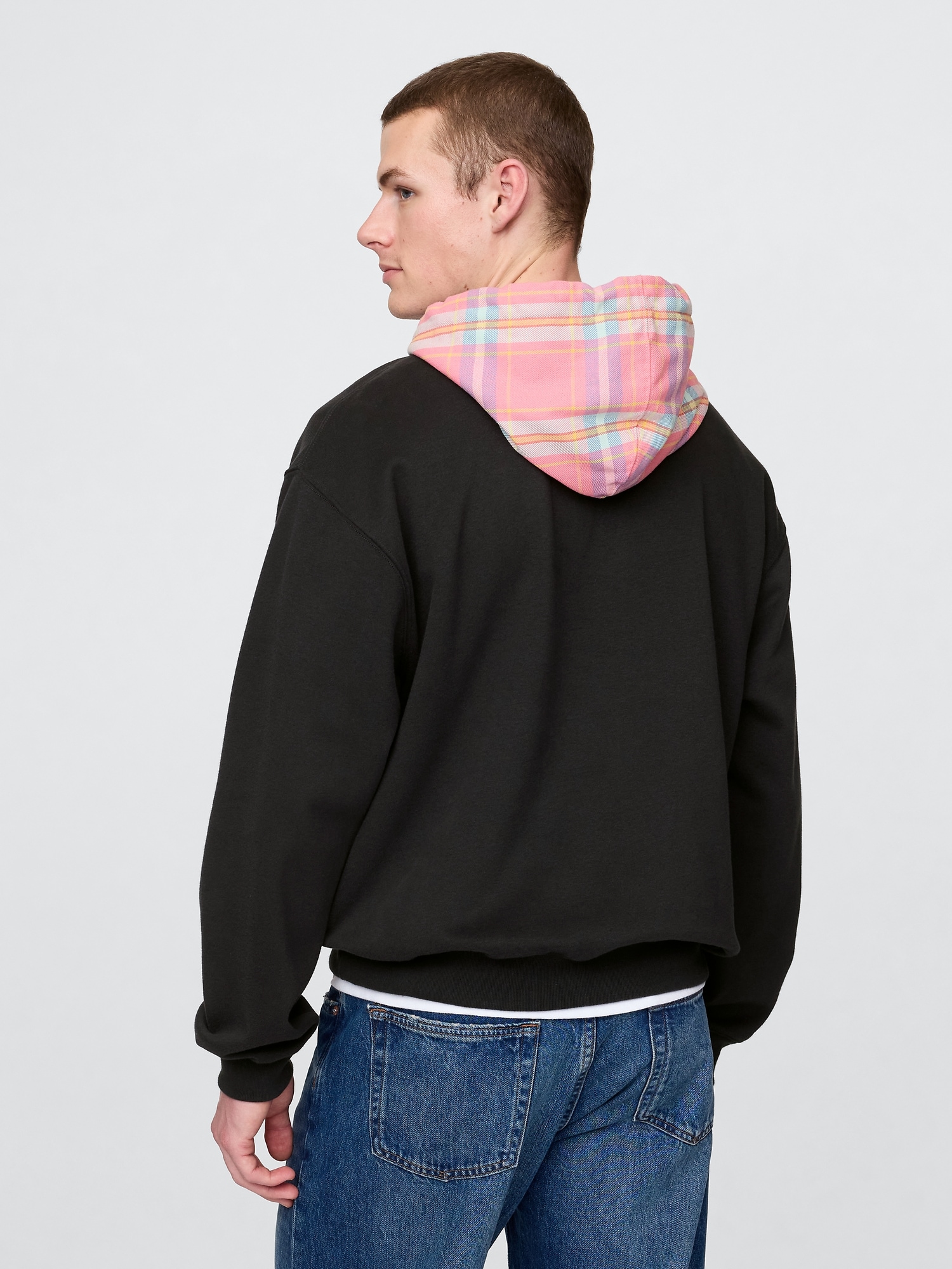- Plaid double-layered hood with drawcords.